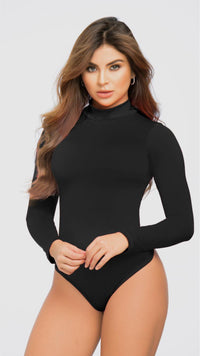 El cuello alto y las mangas largas te protegen del frío con estilo, sin perder el efecto reductor.